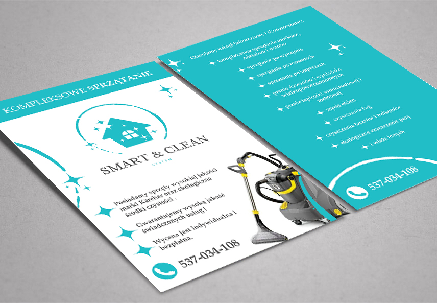 SMART&CLEAN System – Wizytówka i Ulotka Zaprojektowałam materiały drukowane dla marki SMART&CLEAN System, obejmujące wizytówkę oraz ulotkę. Projekty utrzymane są w spójnym, czytelnym stylu, podkreślającym profesjonalny charakter marki. Wizytówka Ulotka Share on Facebook Share Share on TwitterTweet